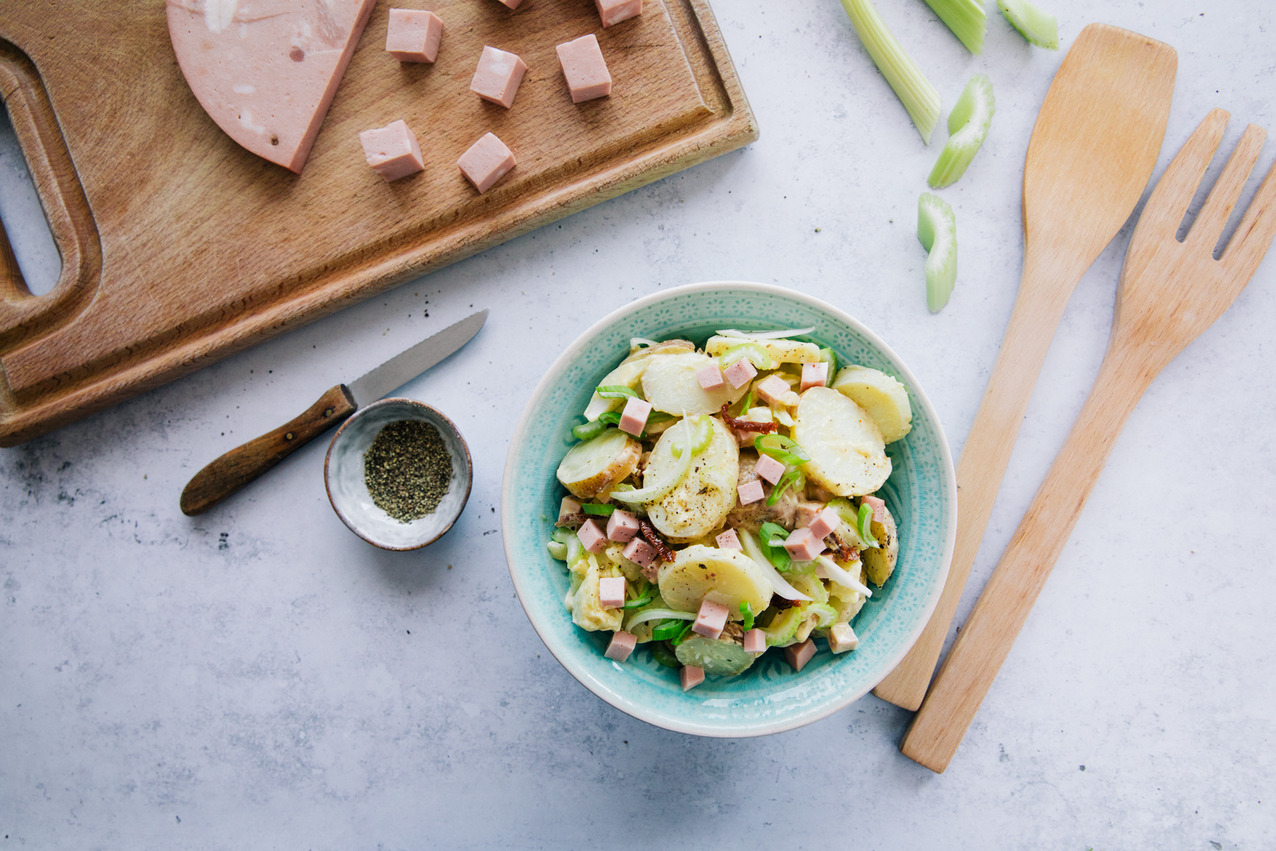 Krompir damo v lonec, prelijemo z vodo, solimo in pristavimo na močan ogenj ter kuhamo približno 20 minut. Kuhan krompir odcedimo in pustimo v cedilu 10 minut, da se dobro izpari. Krompir olupimo in narežemo na debelejše rezine. V skledi premešamo gorčico, jogurt, majonezo, olivno olje, sok limone, česen, mleto papriko in kis. Začinimo s soljo in poprom ter zmešamo s paličnim mešalnikom ali metlico v gladek preliv. Anton mortadelo narežemo na večje kocke. Čebulo in mlado čebulo narežemo na tanke rezine. Stebelno zeleno, sušene paradižnike in peteršilj sesekljamo. Vse sestavine damo v večjo skledo in prelijemo s prelivom. Dobro premešamo in postrežemo toplo ali hladno.