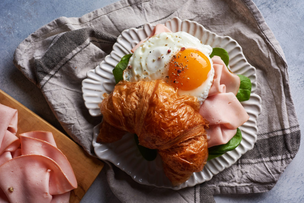 Francoski rogljiček prerežemo na pol. Na spodnjo polovico najprej naložimo mlado špinačo, nato pa še dve ali tri rezine mortadele. Na vrh položimo na oko pečeno jajce, ki ga po okusu začinimo s poporom in soljo. Sendvič »zapremo« z zgornjo polovico rogljička.