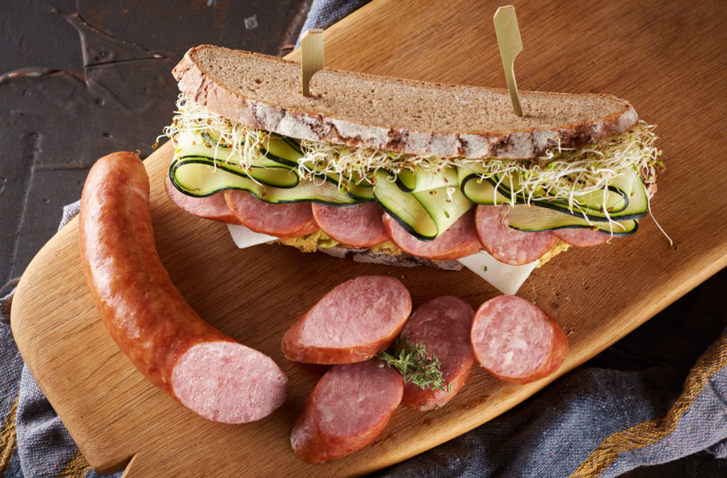 S pretlačenim avokadom obložimo rezino kruha in nanjo položimo eno ali dve rezini kozjega sira, na kolobarje narezano klobaso, kalčke in nekaj rezin bučke.