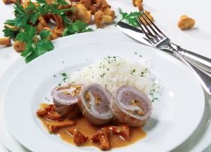 Lisičke in čebulo prepražimo na vročem olju; začinimo s soljo in poprom ter dodamo peteršilj. Nekaj lisičk prihranimo za omako. Zrezke do polovice premažemo z nadevom za pečenice. Po nadevu porazdelimo lisičke. Zrezke zvijemo in povežemo z vrvico (spodnja slika). V primerni ponvi močno segrejemo malo masla in mesne zvitke z vseh strani popečemo. Postopoma dolivamo omako za pečenko ali govejo juho. Na blagem ognju pokrito dušimo do mehkega približno 20 minut. Zvitke vzamemo iz ponve in odstranimo vrvico. Omaki dodamo sladko smetano in prihranjene lisičke ter hitro zavremo.